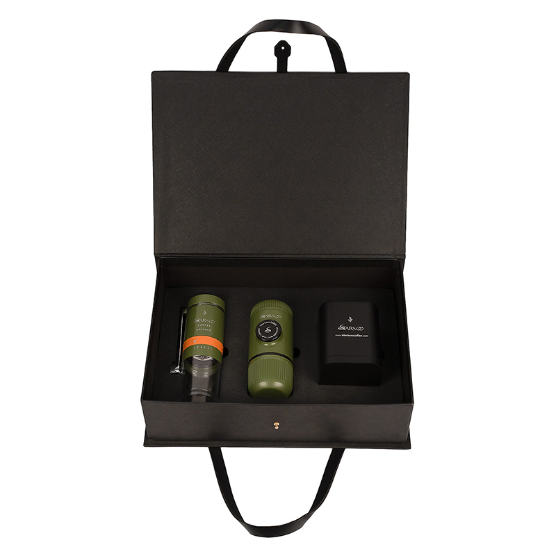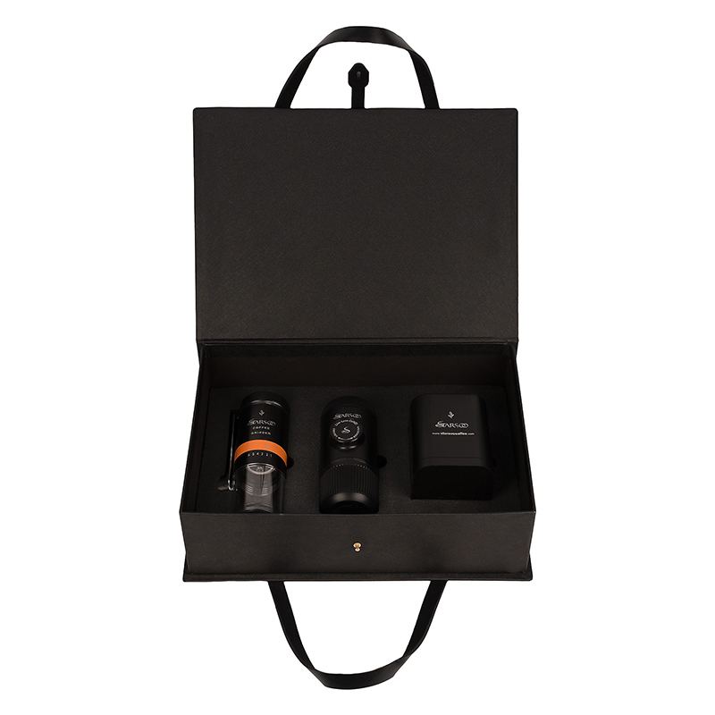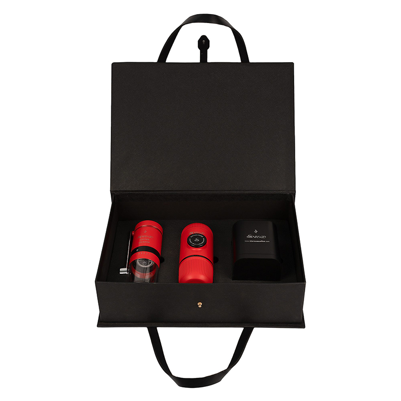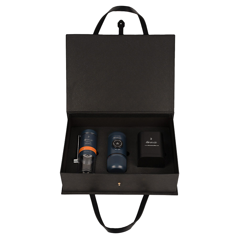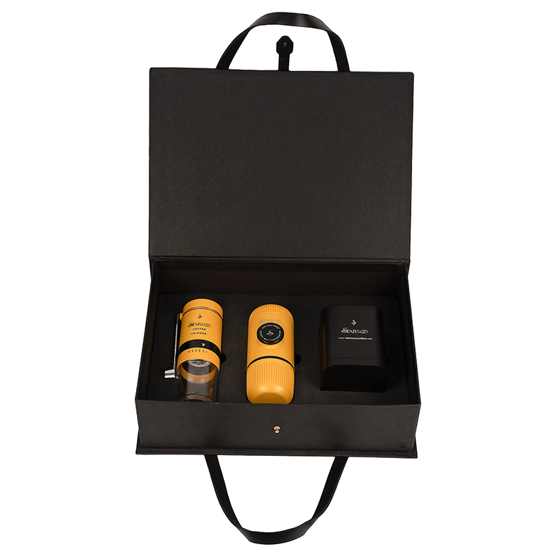 داخل جعبه یک دستگاه اسپرسوساز همراه استارسو قرار دارد که امکان تهیه اسپرسوی غلیظ و خوشعطر را بدون نیاز به برق فراهم میکند. کنار آن آسیاب قهوه همراه قرار گرفته که با یک بانکه نگهدارنده قهوه عرضه میشود.