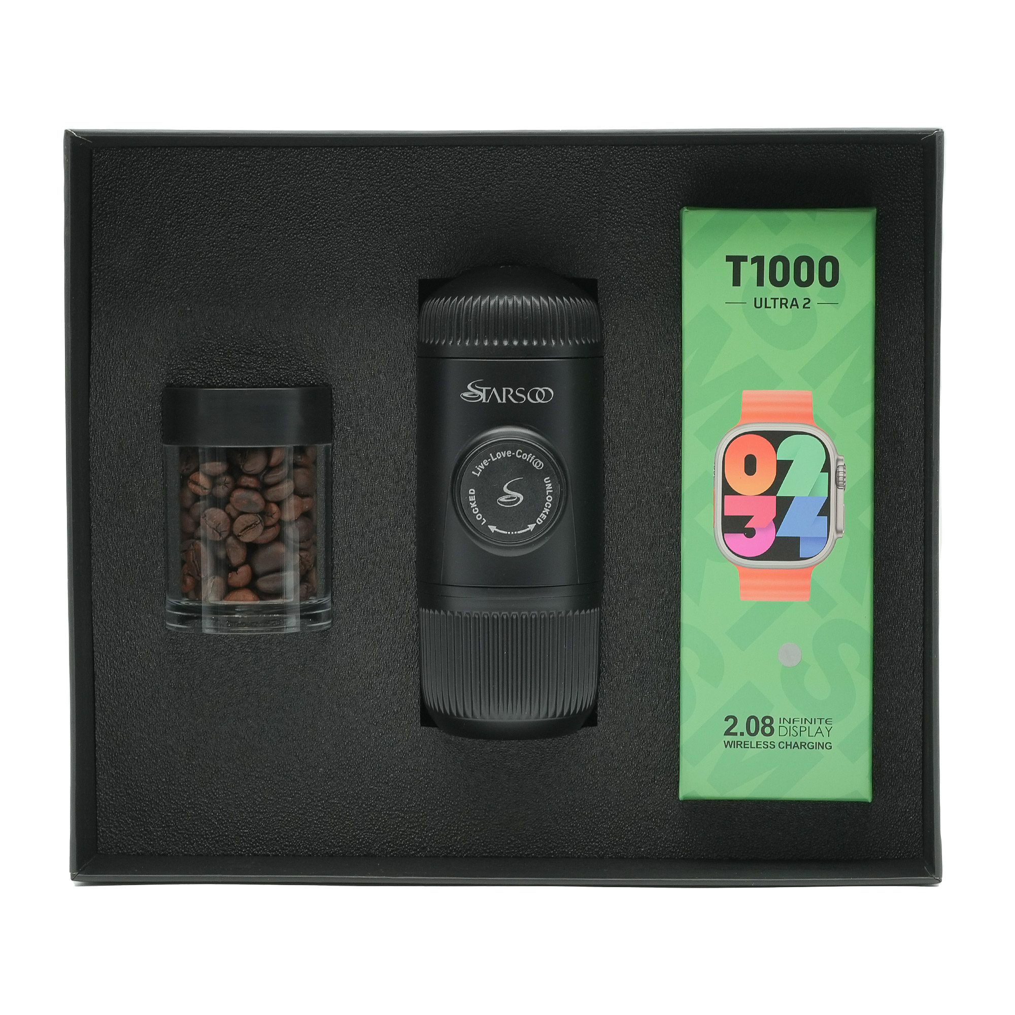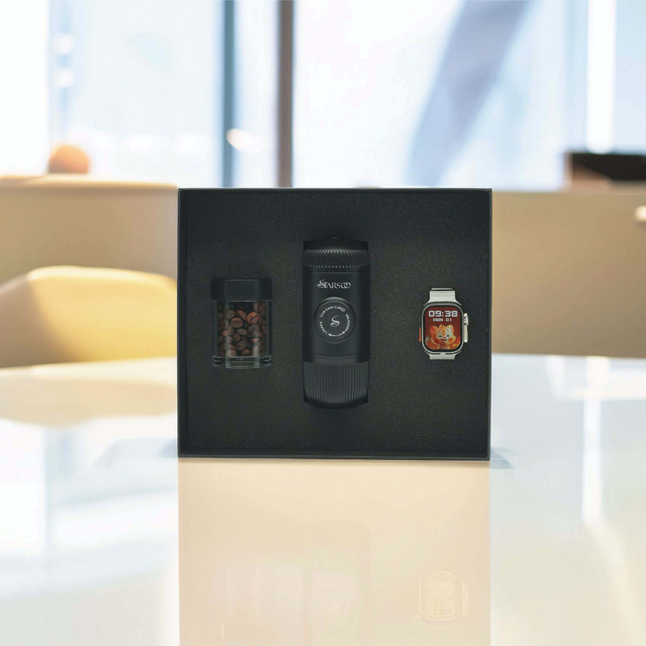 پک هدیه استارسو «قهوه و زمان» شامل دستگاه قهوهساز همراه، یک بانکه کوچک و یک عدد ساعت هوشمند مدل ساعت هوشمند مدل T1000 ULTRA است و بستهبندی آن به شکلی شیک و مورد پسند طراحی شده تا بدون نیاز به آمادهسازی اضافه، مناسب هدیه دادن باشد. این مجموعه برای روز تولد، ولنتاین، سالگرد ازدواج، روز پدر و مادر، روز معلم، هدیه مدیریتی و حتی مناسبتهای سازمانی انتخابی جذاب و متفاوت است.