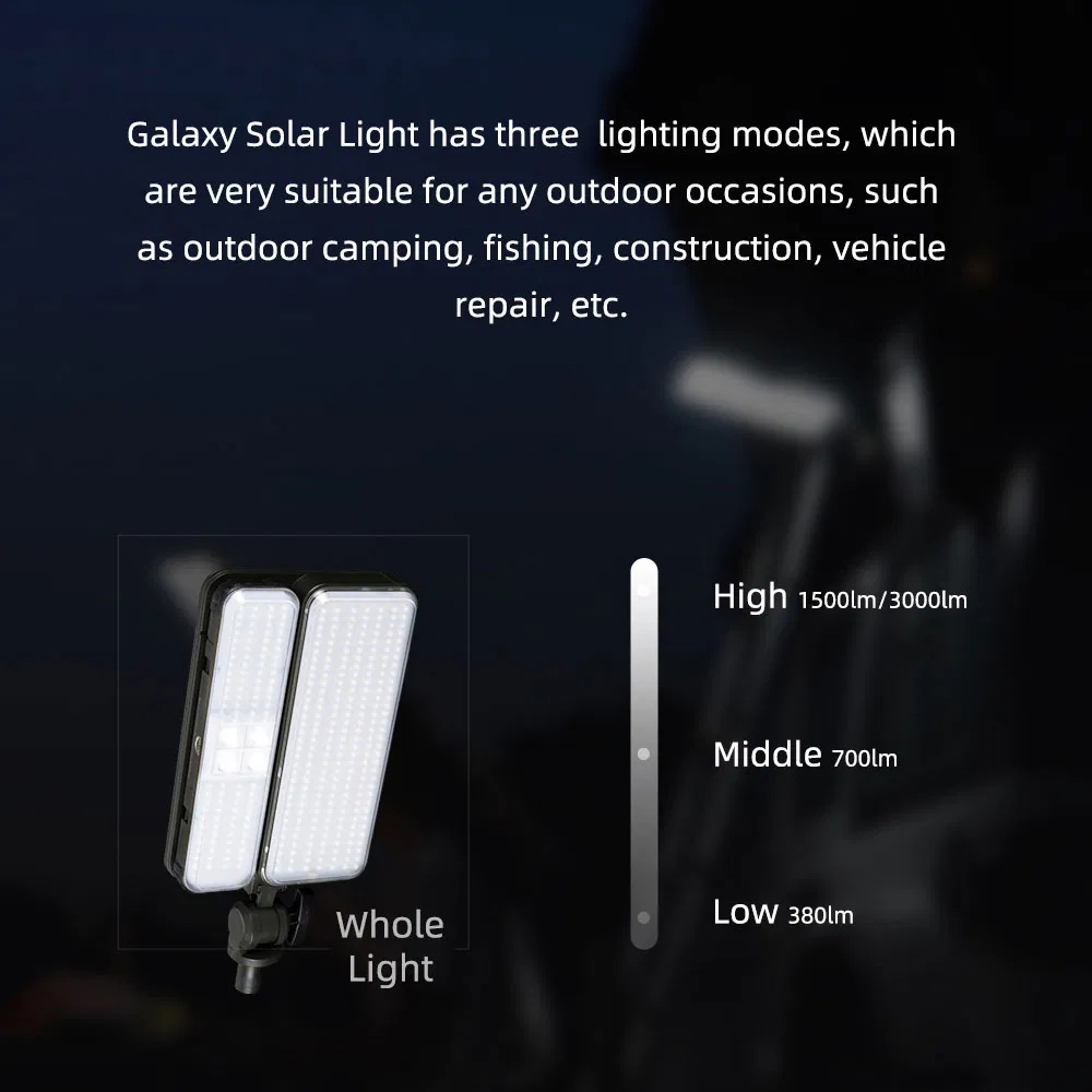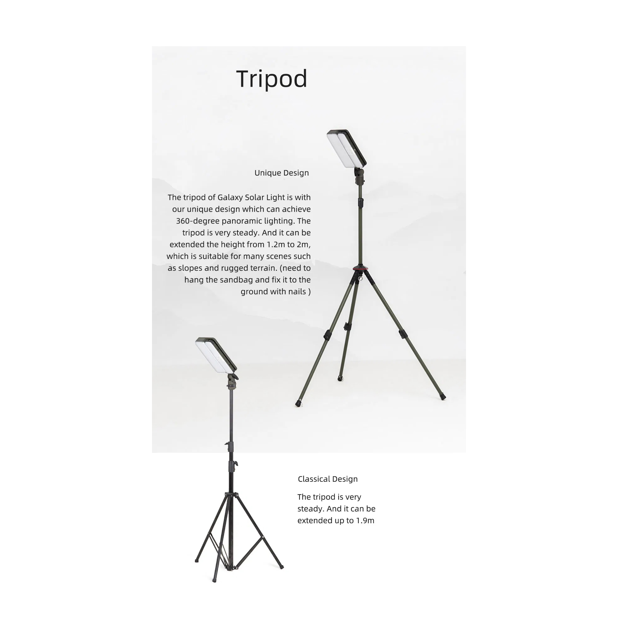 یکی از مهمترین ویژگیهای این مدل، سهپایهی قابل تنظیم تا ارتفاع 1.8 متر است که ثبات و استحکام بالایی دارد. برخلاف بسیاری از چراغهای پرتابل بازار که در زمینهای ناهموار تعادل خود را از دست میدهند، سهپایهی مستحکم Galaxy Solar باعث میشود چراغ در هر شرایطی ثابت بماند. این ویژگی بهویژه هنگام کمپینگ در مناطق بادخیز یا زمینهای شنی بسیار کارآمد است.